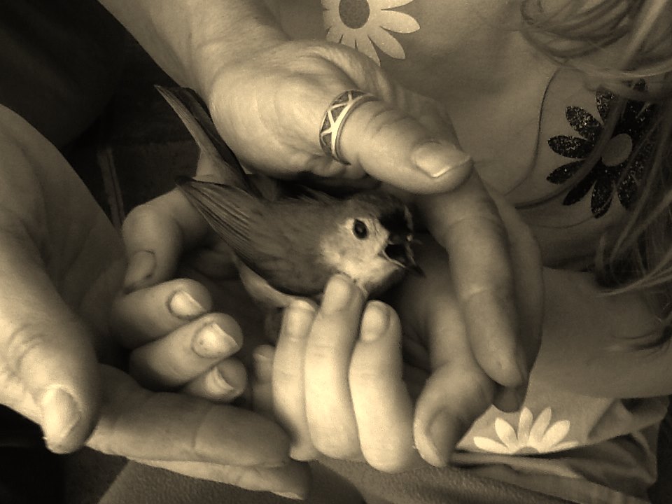 I carefully took the little bird and examined it. It opened its eyes, but stayed very still as the girls stroked it with butterfly-gentle fingertips. After a few seconds, the bird moved from its side and crouched into my hand, clearly disoriented.