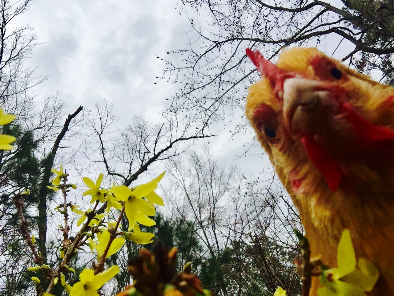 After several years of chicken bliss, tragedy struck one night when an opossum infiltrated the hen enclosure. Rapunzel valiantly fought off the attacker, saving the flock, but incurred a serious wound which later took her life. She was given a heroes’ burial and was mourned by all. Years later, Scarlet succumbed to an illness, and was interred in the chicken burial grounds at the edge of the meadow.