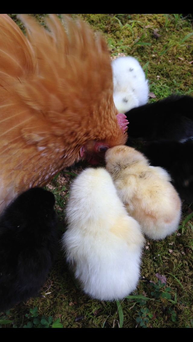 On August 7, Morgan and Olivia were up unusually early to check Ginger’s progress. They ran back in with exciting news. We all hurried outside in the fresh morning air to witness the miracle of hatching: 6 balls of fluff, 3 white and 3 black baby chicks.