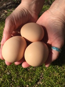 We have since added five new hens to our flock: Bluebell, Opal, Nutmeg, Stella and Lemon Balm. Ginger is still the matriarch. She continues to maintain order and lays three to four big, delicious eggs every week.