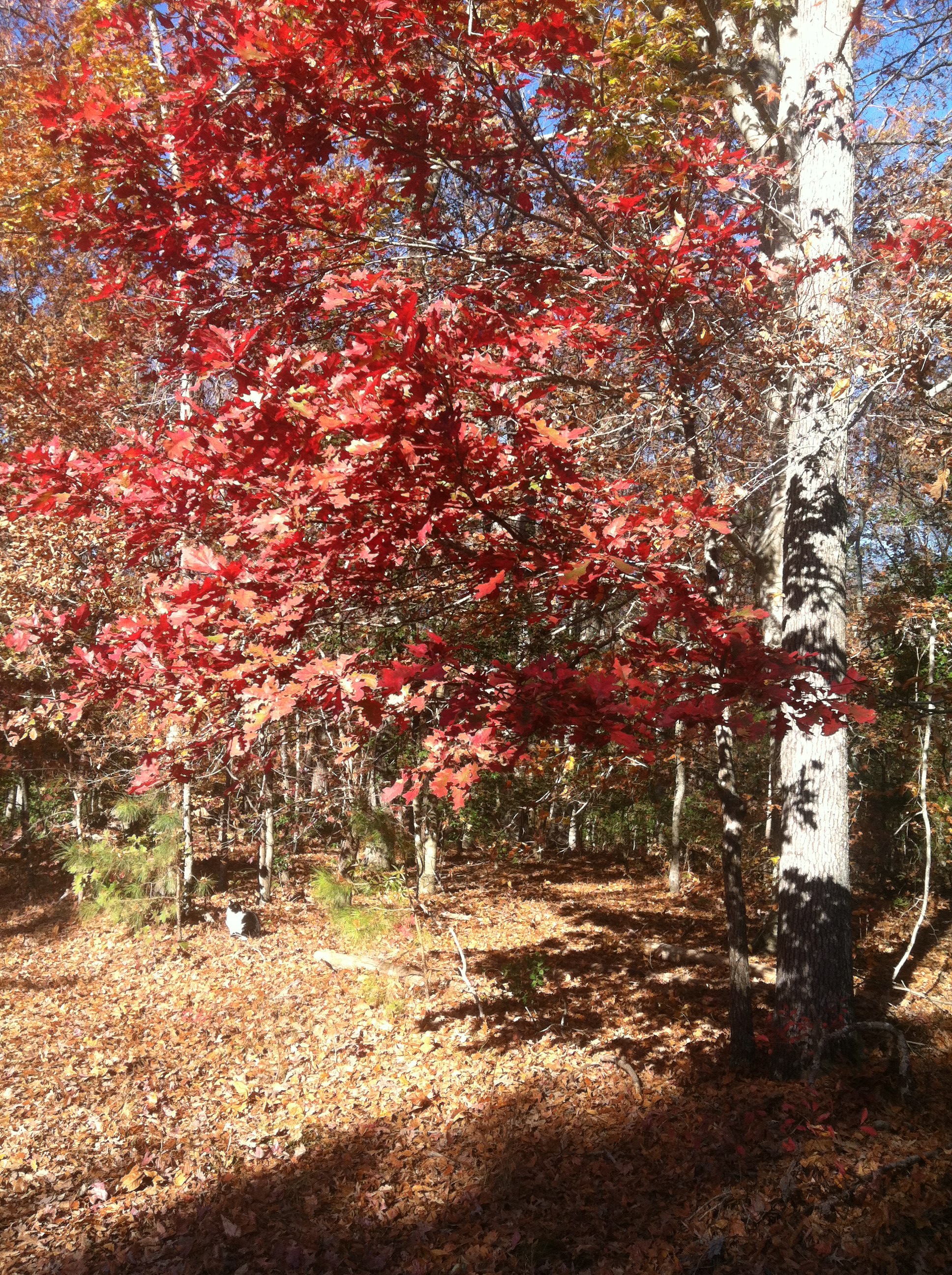 The sun was up past the trees on the other side of the soybean field and the sky was bright blue. One more step took me beneath the branches and I turned my face up to the canopy of leaves. Sunlight streamed through the rust colored leaves, turning them into rubies blazing forth with scarlet light. Just as it had been yesterday, the view gazing up from below was dramatically different than the one from the side.